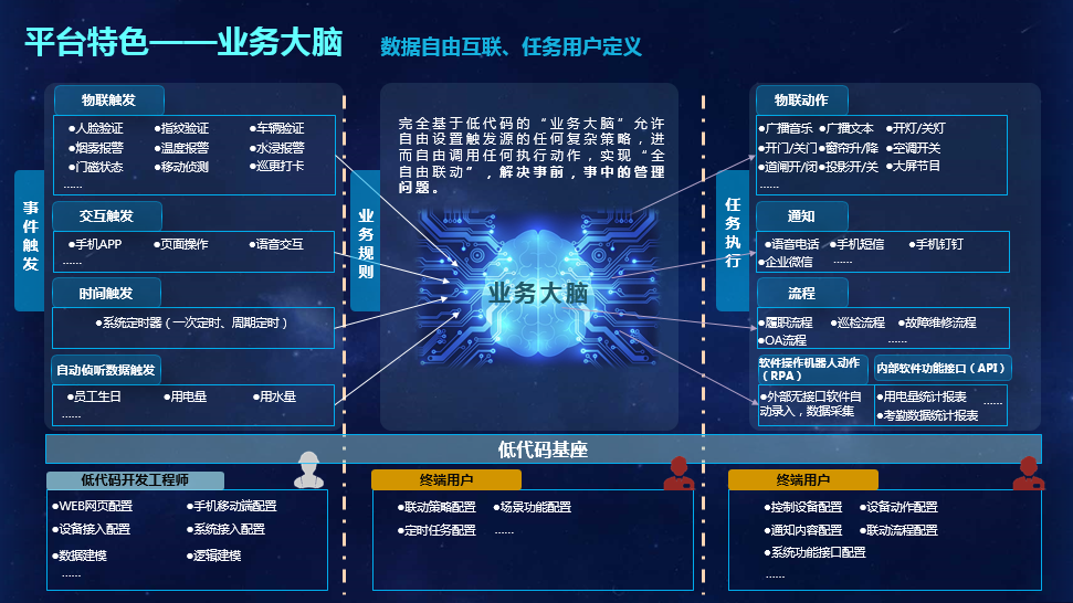 浩云智慧樓宇解決方案是以低代碼智慧物聯(lián)管理平臺(tái)為核心,平臺(tái)以低代碼引擎為底座,標(biāo)準(zhǔn)化物模型支撐各廠商設(shè)備統(tǒng)一接入,實(shí)現(xiàn)全面控制、聯(lián)動(dòng)。平臺(tái)可讓原本各自為陣的所有子系統(tǒng)在平臺(tái)的支撐下形成有機(jī)整體,并可以在平臺(tái)大腦的支持下實(shí)現(xiàn)自動(dòng)化、智能化運(yùn)行。從而打破信息孤島,為大樓運(yùn)營管理及數(shù)字化能力提升提供先進(jìn)技術(shù)手段。有效提升管理效率、減少人力投入、可對(duì)各職能部門業(yè)務(wù)賦能、實(shí)現(xiàn)資源共享、降本增效。